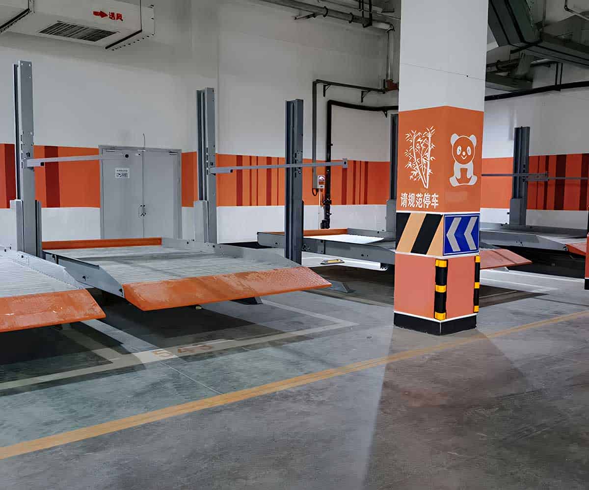 四柱机械停车库的底部配有一个升降平台,其升降动作由电动机驱动。车辆在进入停车库后,平台将车辆提升至适当高度,便于后续的存放。